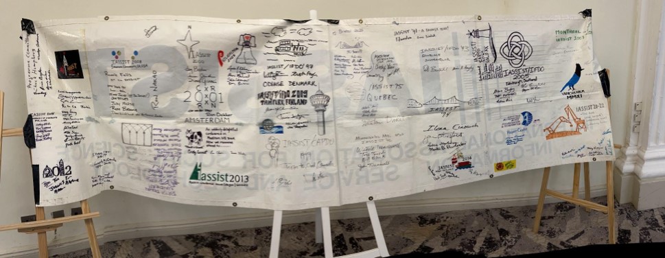 Back of the IASSIST conference banner with all signatures and greetings made by the local hosts over the years.